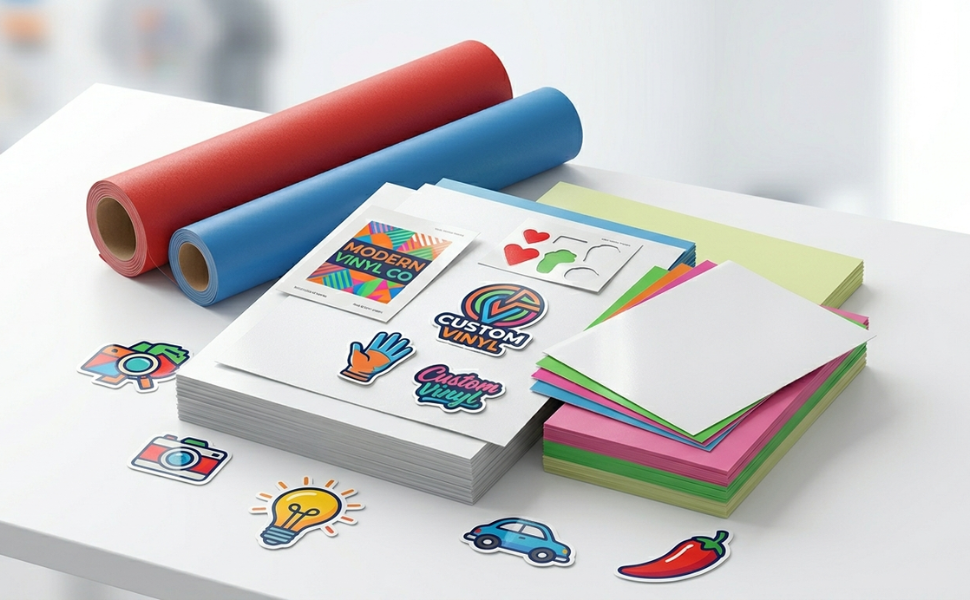 Durable waterproof vinyl stickers and branding prints with premium finish.