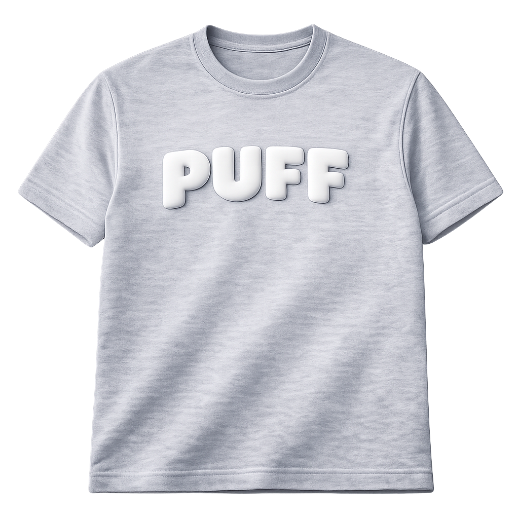 Puff Printing uses a special foam-based additive mixed into the ink that expands when exposed to heat during the curing process. The result is a raised, three-dimensional texture that you can both see and feel. It adds a premium, tactile quality to logos, lettering, and graphic elements making designs pop off the fabric in a way flat printing simply can't replicate. Puff Printing is hugely popular in streetwear, varsity apparel, high-end fashion labels, and any brand looking to add a luxury dimension to their garments.